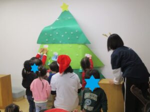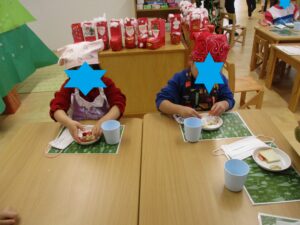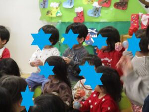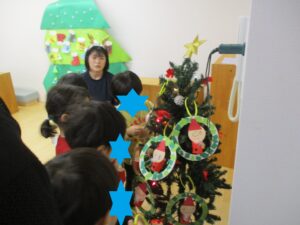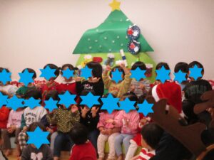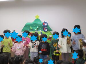 待ちに待ったクリスマス会でした。0,1歳児は手作り楽器で合奏をし、2,3歳児は振り付けをしながら歌を歌いました。