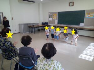 今年も地域のおじいちゃんおばあちゃんとの交流会に2歳児が参加しました。 始めは緊張していた子ども達でしたが、ダンスの披露をする時には音楽が流れいつもの練習していたダンスが出来ていました。 その後、手遊びを一緒にして遊び「やきいもグーチーパー」「しあわせならてをたたこう」をおじいちゃんおばあちゃんが真似てくれていました。 最後は、2歳児のリクエスト「おおきくなったら何になろう」を聞いていただき、一人ずつなりたいものを答え、おじいちゃんおばあちゃんもびっくりされてました。 サプライズで、お誕生日の方がいたので保育園でいつも誕生日の友達で歌っている「たんたん誕生日♪」を歌いお祝いしました。誕生日の人に質問もしてみる子ども達でした。