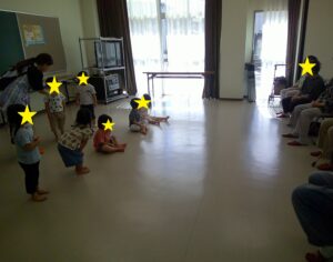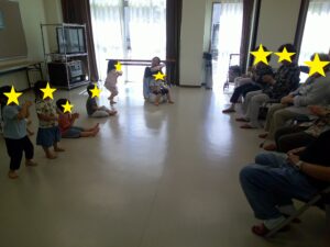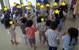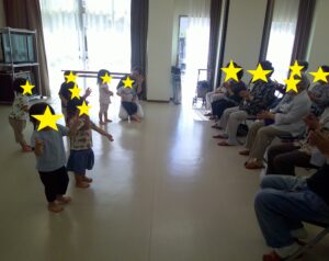 その後、手遊びを一緒にして遊び「やきいもグーチーパー」「しあわせならてをたたこう」をおじいちゃんおばあちゃんが真似てくれていました。