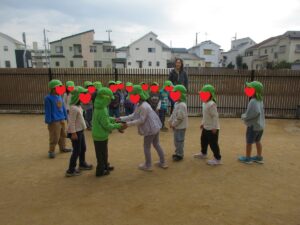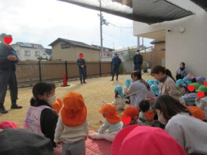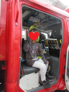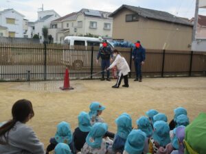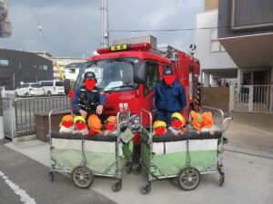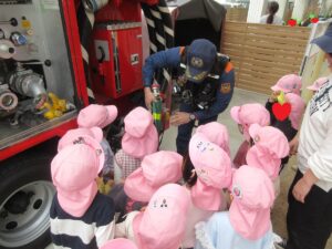 避難訓練で消防士さんが園に来てくださり、お話を聞きました。職員による消火訓練やバケツリレーを見て「がんばれー!」と元気に応援する子どもたちでした。その後は、消防車の前で写真を取ったり、中を見してもらったりして嬉しそうでしたよ。みのり組さんは、バケツリレーにも挑戦してみました!上手に運べていましたよ。