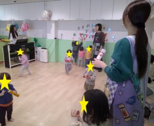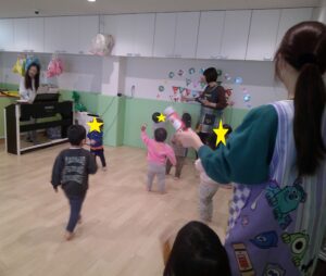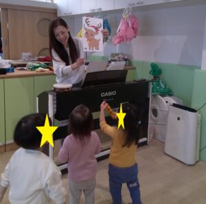 「あわてんぼうのサンタクロース」のピアノに合わせて、手作り楽器で鳴らしたり、振り付けもしながら踊ったり子供たちもノリノリでした。