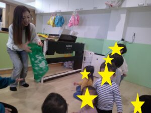 スカーフを使ってピアノに合わせて表現する遊びでは、友達と向い合せになりながら楽しむ子、振ったり上下に揺らしたりする子、リズムに合わせ色とりどりのスカーフがきれいに表現せれていました。
