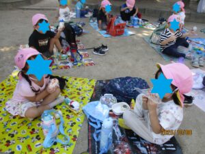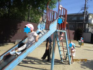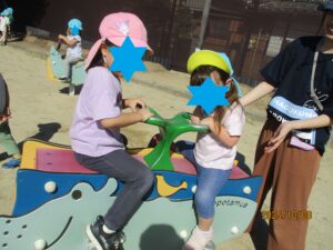 有岡公園へ遠足に行きました。公園ではブランコや滑り台、スプリングをして遊んだり 砂場で石集めをして友だちと見せ合いっこをしたりしました。 広場ではみんなで追いかけっこもしましたよ。 おいしいおにぎりも食べて大喜びでした。