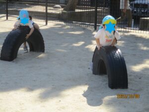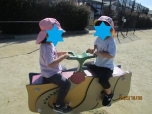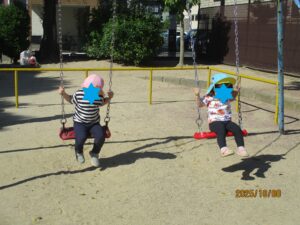 有岡公園へ遠足に行きました。公園ではブランコや滑り台、スプリングをして遊んだり