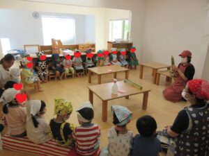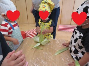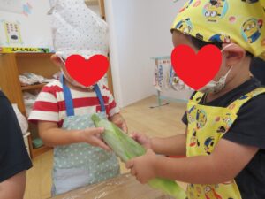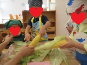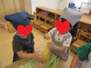 2歳児(あおば組)は、初めてのクッキングでトウモロコシの皮むきをしました。お調理さんの話もしっかり聞くことができ、お友だちと協力して楽しくクッキングできました。