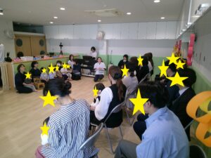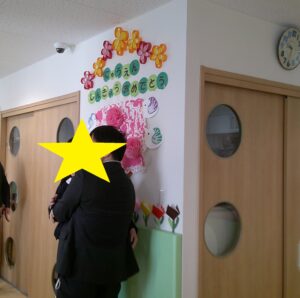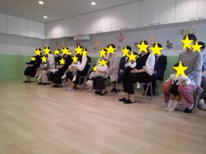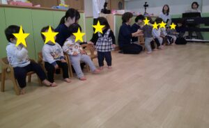入園のお友達と進級の子ども達と一緒におめでとう会をしました。みんな緊張している中でしたが、職員紹介を歌に合わせてすると、手拍子したり歌ったりしながら、緊張が少しづつなくなっていました。
