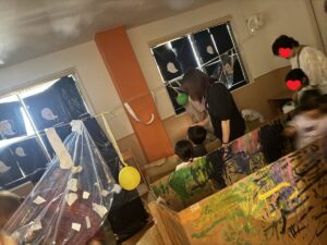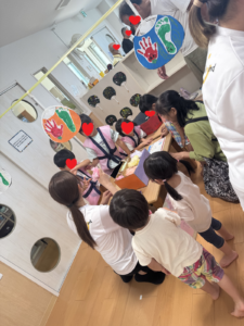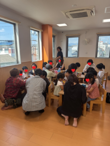 今年度の敬老の日の集いでは、おじちゃん、おばあちゃんと一緒に秋祭りを楽しみましたよ。 何のお店がいいかな?と子どもたちと話し合い、何を作ったらいいかな?と意見を出し合いながら準備をしました。おじちゃん、おばあちゃんに見てもらえて一緒にまわれて、とても嬉しそうでしたよ