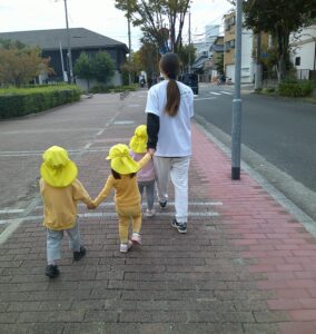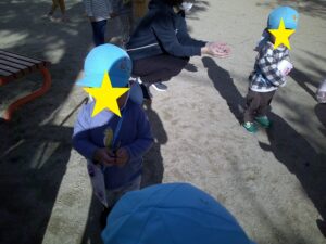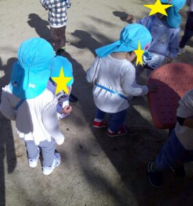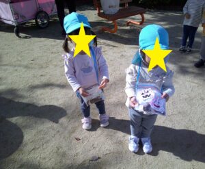 0.1歳児は公園までどんぐりを拾いに行きました。1歳児は、自分たちで作ったかばんを一人一つずつ持ち、見つけたどんぐりを1個ずつかばんに入れる子もいれば、大切に手に持ったままの子もいて、それぞれ楽しんでひろっていました。「うわーここにもある」「みてみておおきよ~」と言いながら見せてくれる子ども達でした。
