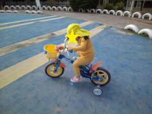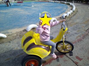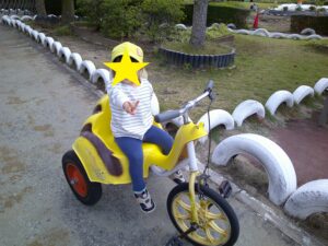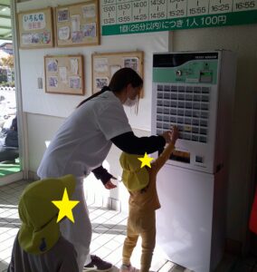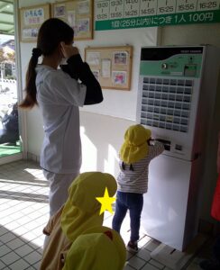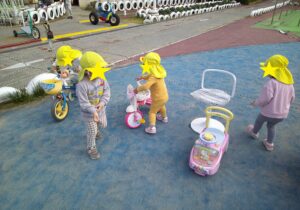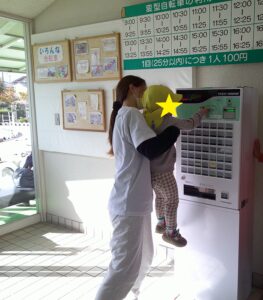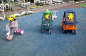 2歳児は、稲野公園運動施設まで行きました。100円を持ち切符を買うことを一人ずつ行い、その切符を大事に持って落とすこともなく時間が来るのを待っていました。順番が来ると、切符をかごに入れ、「なに乗ろうかな」「これたのしそう」と言いながら、順番に乗りたいのりものを乗りました。大きな自転車にも挑戦したり、「この車、ガソリン入れるところあるよ」と見つける子供もいたり、時間内でたくさんののりものに乗ることができました。