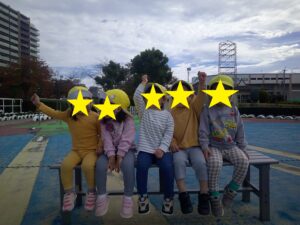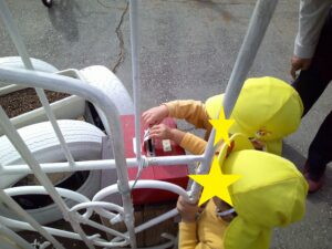 0.1歳児は公園までどんぐりを拾いに行きました。1歳児は、自分たちで作ったかばんを一人一つずつ持ち、見つけたどんぐりを1個ずつかばんに入れる子もいれば、大切に手に持ったままの子もいて、それぞれ楽しんでひろっていました。「うわーここにもある」「みてみておおきよ~」と言いながら見せてくれる子ども達でした。 2歳児は、稲野公園運動施設まで行きました。100円を持ち切符を買うことを一人ずつ行い、その切符を大事に持って落とすこともなく時間が来るのを待っていました。順番が来ると、切符をかごに入れ、「なに乗ろうかな」「これたのしそう」と言いながら、順番に乗りたいのりものを乗りました。大きな自転車にも挑戦したり、「この車、ガソリン入れるところあるよ」と見つける子供もいたり、時間内でたくさんののりものに乗ることができました。 帰りに、隣にある滑り台もみんなで楽しみ、いつもとは違う経験ができ、満足そうな子供たちでした。