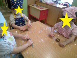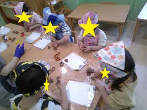 2歳児のクッキング。たくさん行ってきましたが、最後にクッキー作りに挑戦!2回目の挑戦でしたが、とても上手になりほぼ一人で出来みんな満足そうで、「楽しかった~。いっぱい作れたね」と話をしていました。