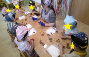 ジャガイモの入れる向きや、土のお布団優しくかぶしてねと伝えながら行い、みんなそーっと入れて布団をかぶしてあげていました。「水やりもしていって大きくなる姿みようね」と話をして、今日から観察開始です。